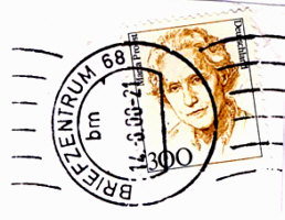 | Durch die fortschreitende Automatisierung bei der Post und den Wegfall des Briefpost-Monopols werden in einigen Jahren schöne gestempelte Ganzbriefe zu Raritäten. Ob die auf den Markt drängende private Briefpost Briefmarken, wie sie die Deutsche Post hat, auch vertreiben wird ist zur Zeit noch nicht ab zu sehen. Vermutlich wird man an einem Automaten sich einen Code-Streifen kaufen können, den man dann ähnlich wie Briefmarken auf den Brief kleben muß.